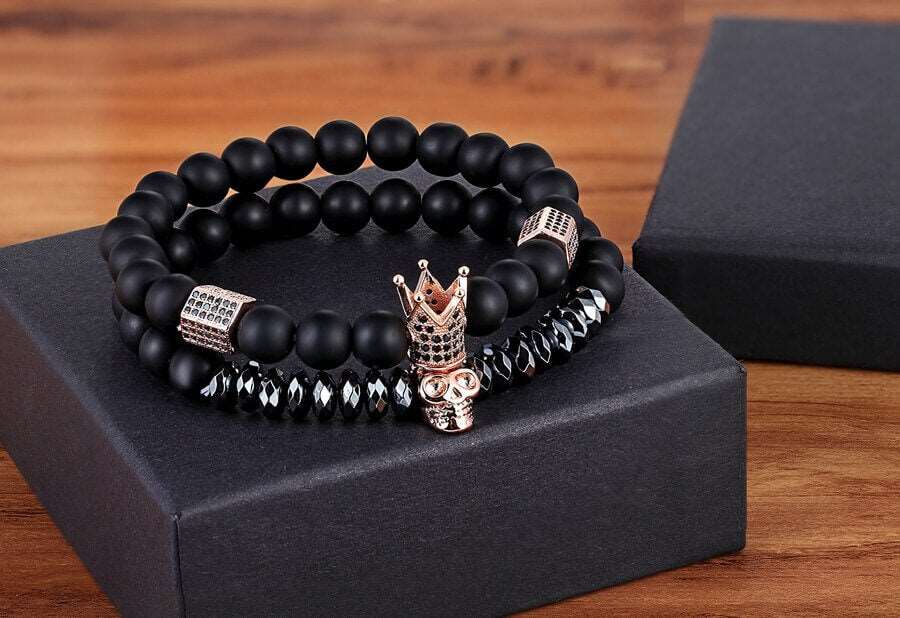 brățara de onyx stone este o serie de două straturi de brățări, fiecare cu pandantive de dimensiuni proprii. cel mai interesant aspect constă în faptul că aici se pot observa pandantive în formă de coroană și craniu. pandantivul cu coroană simbolizează liderul, autoritatea și încrederea.