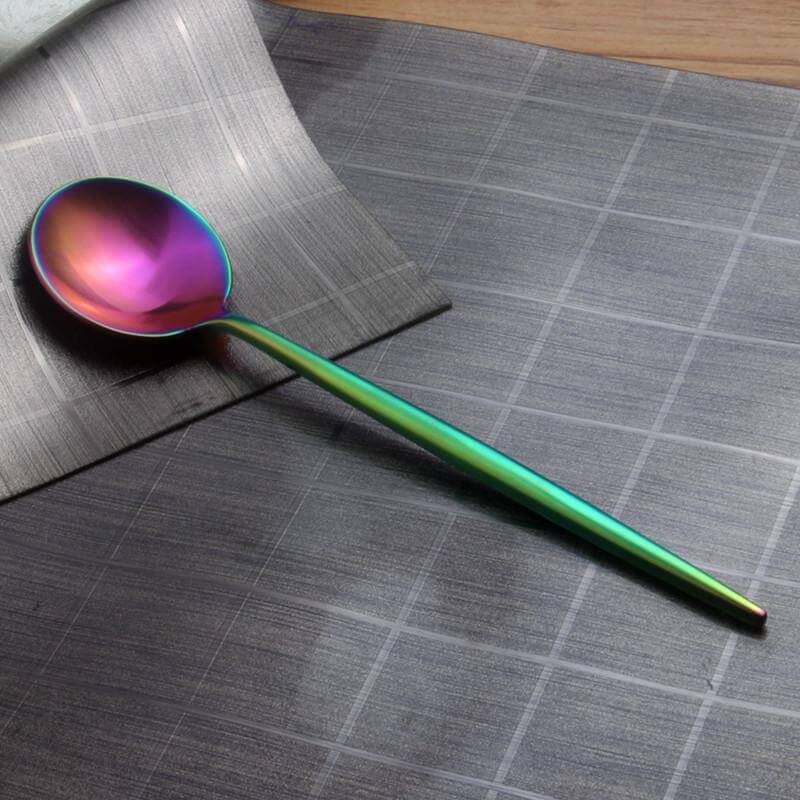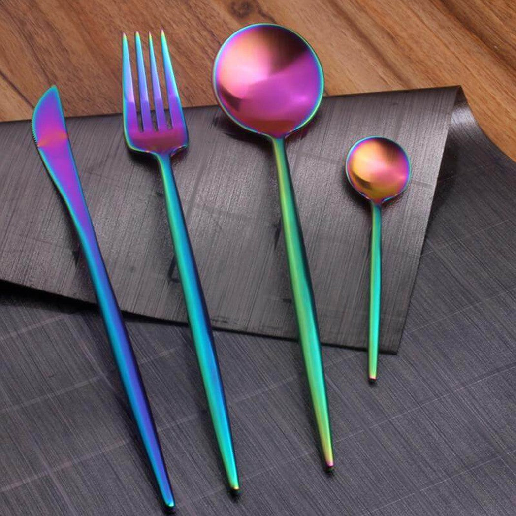 cu un set de tacâmuri în culori curcubeu, vei adăuga ceva plăcut, distractiv și satisfăcător mesei tale.
