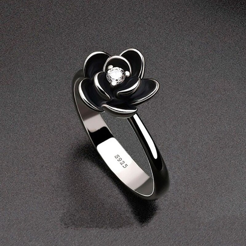 îmbogățiți-vă vârfurile degetelor cu o notă de stil rafinat cu acest inel goth negru și argintiu. decorat cu o eleganta floare neagră inspirată de dalie, acest inel superb prinde viață datorită pietrei de zirconiu în centrul său, oferind un strop de strălucire.