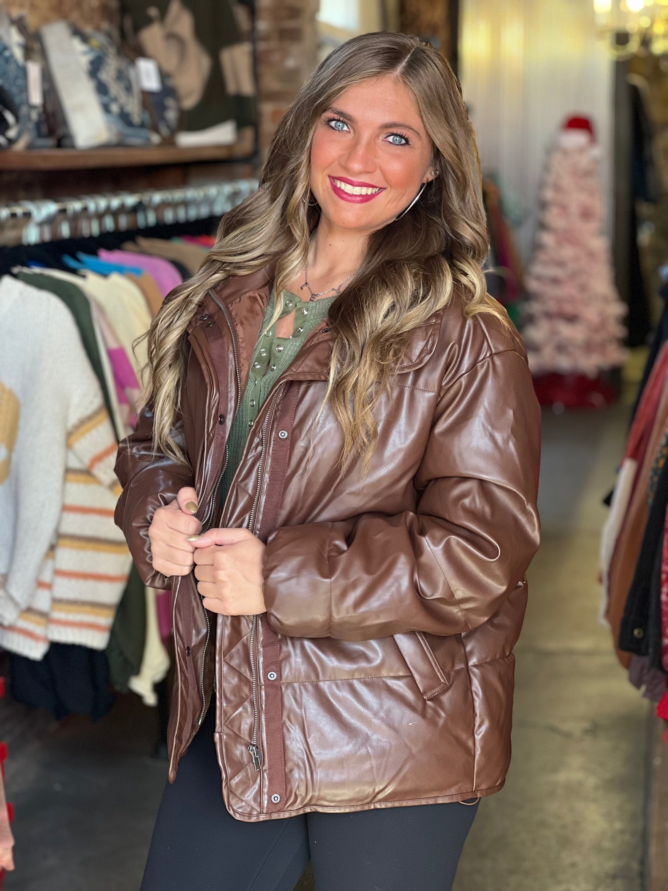 Simțiți-vă caldă și elegantă în această jachetă puffer superbă. Pielea luxoasă și culoarea ciocolată intensă o fac un accesoriu perfect pentru garderoba dumneavoastră.