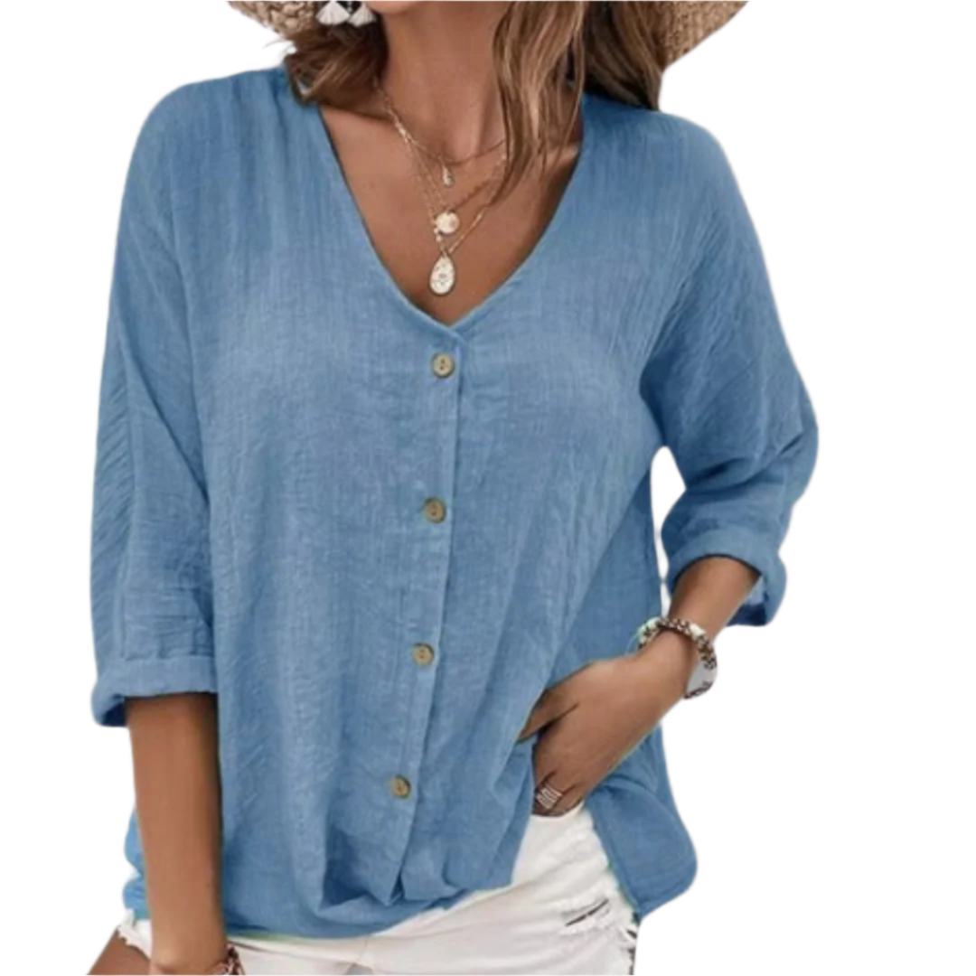 Cu croiala sa relaxată, partea din față cu nasturi și mâneci suflecate, acest top este ideal pentru ieșirile relaxate sau zilele însorite la plajă. Decolteul în V adaugă o notă rafinată ținutei tale.