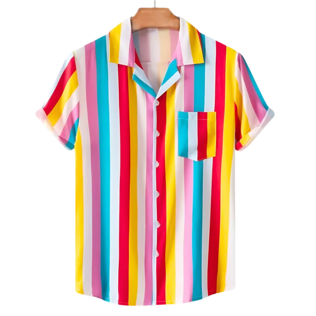 Această cămașă este concepută cu o croială relaxată care asigură libertate de mișcare. Dungile vii conferă un aspect jucăuș, făcând-o o alegere excelentă atât pentru ocazii informale, cât și semi-formale.