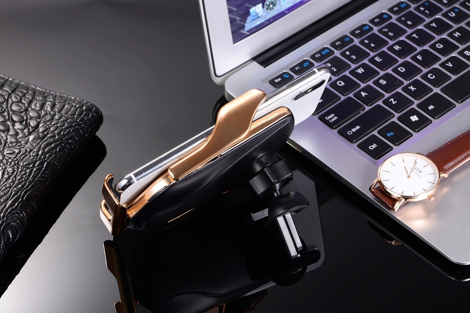 acest suport pentru telefon se deschide și se închide automat și poate încărca telefonul tău wireless. datorită sistemului de prindere, poți atașa suportul la grila de ventilație sau la parbriz, permițându-ți să operezi totul în condiții de signță cu o singură mână.